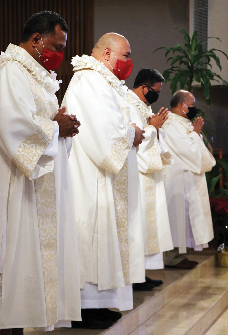 For a “sold out” service, the Jan. 9 ordination Mass for four permanent deacons at the Co-Cathedral of St. Theresa in Honolulu looked half empty after one took into account all the socially distanced seating that had to be arranged in the spacious church.