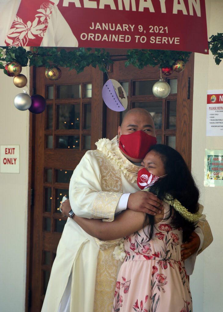 Deacon and Mrs. Costales’ three grown children, Mikaela, Deven and Tyra, made the trip to Oahu for their dad’s ordination, along with about a dozen or more other friends and family. The Lanai contingent all wore masks with the outline of the small island on them, a fundraiser for Lanai High School.