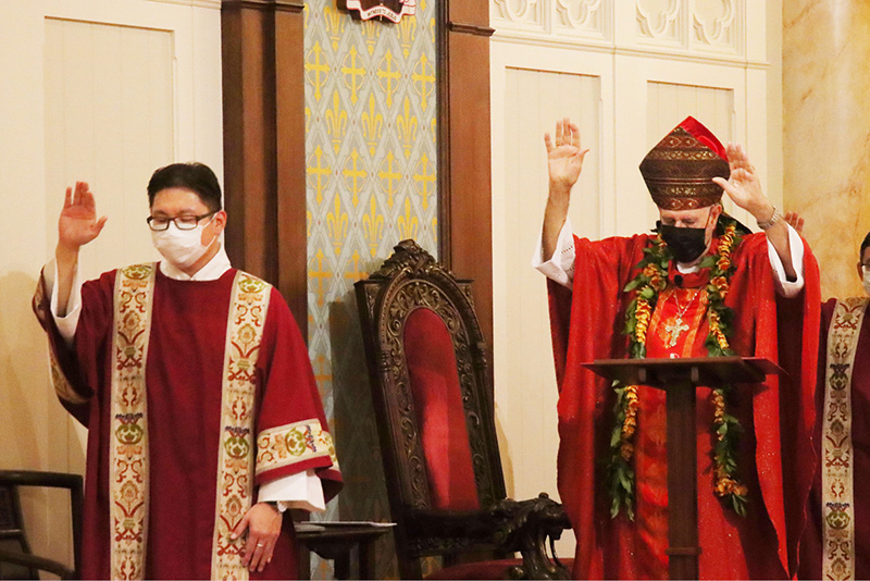 Above, Deacon Keith Cabiles and Bishop Larry Silva extend their hands in blessing over the civic officials gathered for the Red Mass Jan. 19 in the Cathedral Basilica of Our Lady of Peace. (Photo courtesy of Dann Ebina)