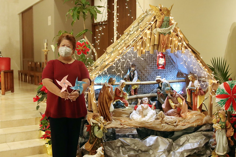 Gloria Butac, the president of the Co-Cathedral of St. Theresa’s Filipino Catholic Club, in front of the church’s 2020 manger scene. (Photo: Dann Ebina)