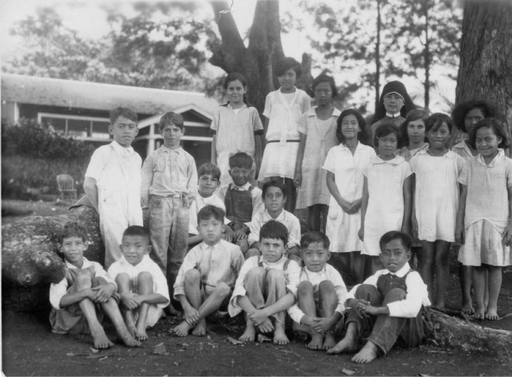 Maryknoll Sister Pieta Kirby with her St. Ann sixth grade students in 1929. (University of Southern California Libraries)