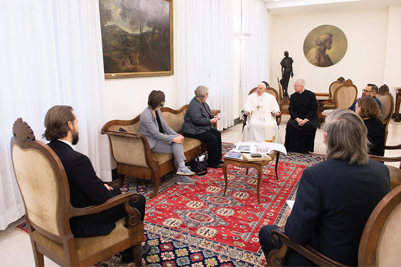 Pope Francis meets with members of the Catholic News Service Rome bureau at the Domus Sanctae Marthae at the Vatican Feb. 1. The special audience was in recognition of the 100th anniversary of CNS. Pictured from left are Robert Duncan, multimedia journalist; Carol Glatz, correspondent; Cindy Wooden, bureau chief; Pope Francis; Father Paul F. deLadurantaye, a priest of the Diocese of Arlington, Va., and an official at the Vatican Secretariat of State; Junno Arocho Esteves, correspondent; Joanna Kohorst, administrative assistant; and Paul Haring, senior photographer. (CNS photo/Vatican Media)