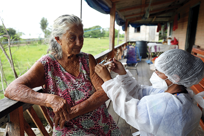 Eronildes da Silva receives the Oxford-AstraZeneca COVID-19 vaccine near the Solimoes River, in Manacapuru, Amazonas state, Brazil, Feb. 1. (CNS photo/Bruno Kelly, Reuters)