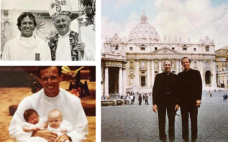 Bishop Scanlan with Father Secor after the latter’s ordination Mass. Father Secor with two of his nieces, Jennifer and Nicole, on the day he baptized both. Then-Father Larry Silva and Father Secor outside St. Peter’s Basilica at the Vatican during Father Secor’s first trip to Rome. Father Silva was on sabbatical at the time studying at the Pontifical North American College. (Courtesy photos all)