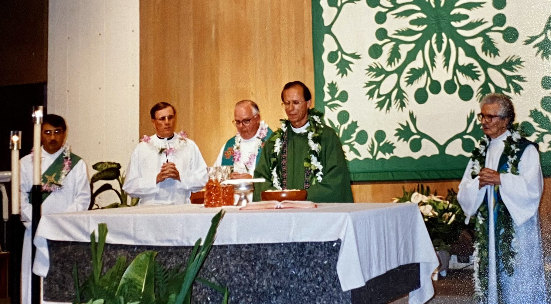 Then-Father Gary Secor, pastor, in green alb, presides at the 25th anniversary Mass for St. John Apostle and Evangelist Church in Mililani. Concelebrants were Father Anthony Pascale, former pastor, and Fathers Art O’Brien and Dennis Koshko (second from left), former associate pastors. At far left is Deacon Wally Mitsui.