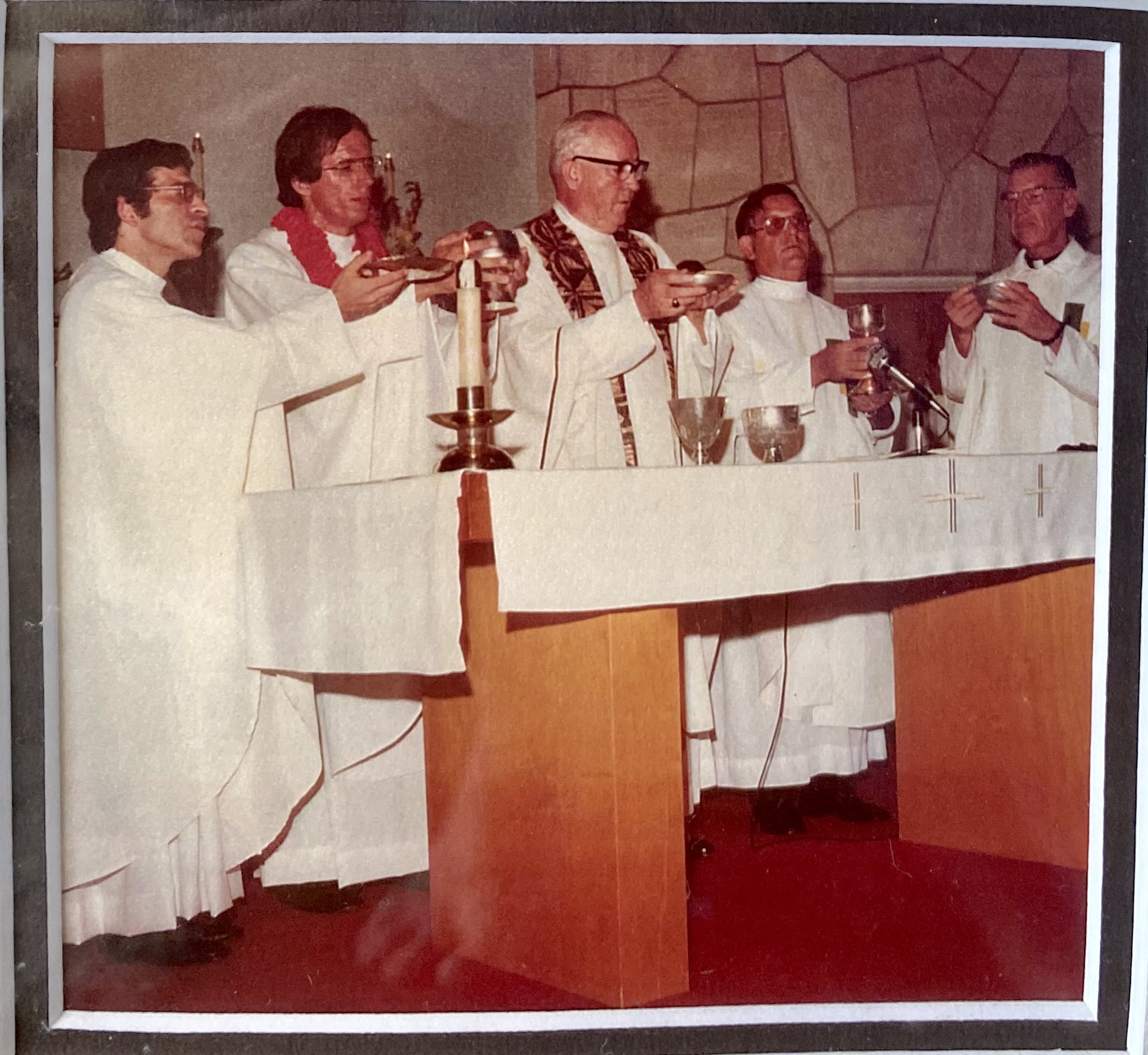 Father Gary Secor’s 1977 priesthood ordination. From left: Father Pat Freitas, Father Secor, Bishop John Scanlan, Father Joseph Ferrario, and Father John Read. (Courtesy photo)