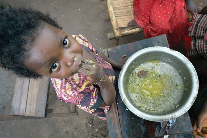 A girl eats a meal at a camp for people displaced within South Sudan, in Riimenze, April 29, 2017. Parts of Yemen, South Sudan, Burkina Faso and Nigeria are close to or already facing famine. Other countries face severe food insecurity or worse. (CNS photo/Paul Jeffrey)