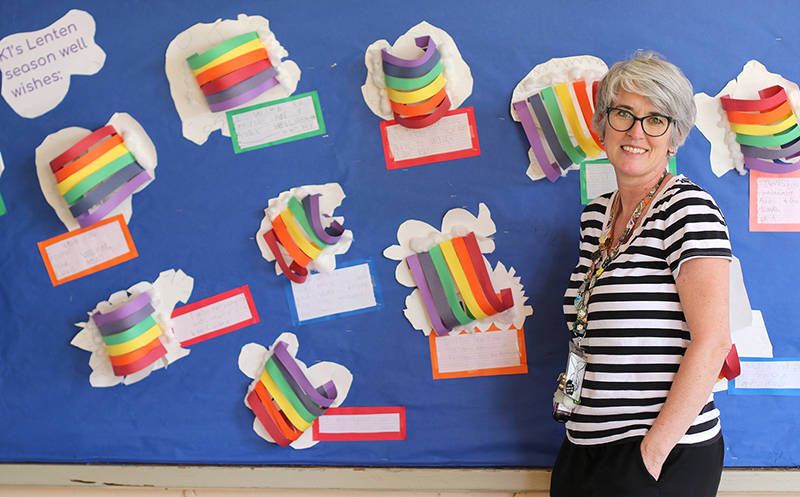 Mary, Star of the Sea art teacher Stacey Taylor stands in front of an art project the kindergarten class did for Lent this year. (HCH Photo | Anna Weaver)