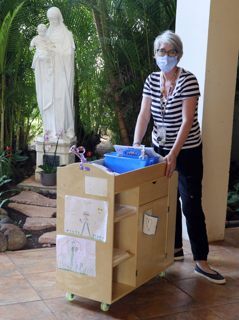 Stacey Taylor has made her art class mobile at Mary, Star of the Sea School in Waialae-Kahala due to COVID-19. Instead of students coming to her art room, she wheels her “art cart” between classrooms, tooting the purple horn attached to it as she goes.