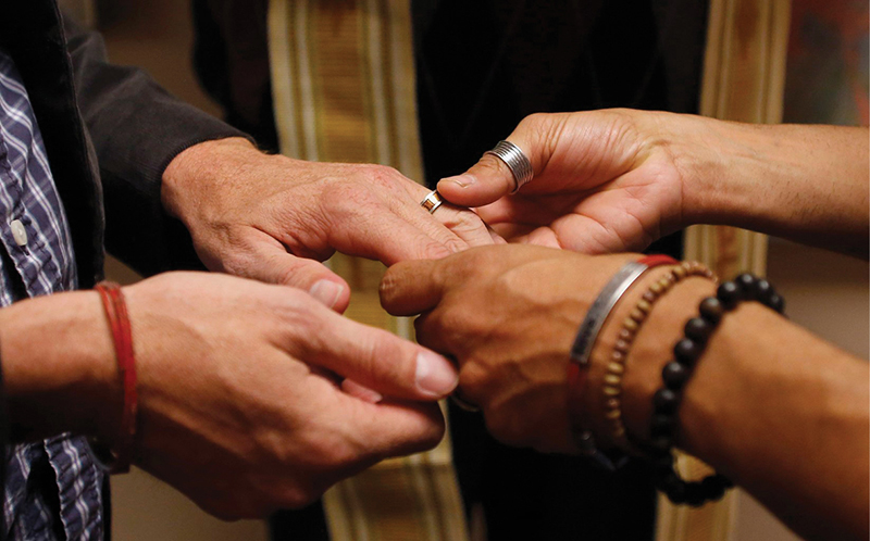 A same-sex couple is pictured in a file photo exchanging rings during a ceremony in Salt Lake City. The Vatican’s doctrinal office says in a new note that any form of blessing of same-sex unions is “illicit,” but that the negative judgment is on the blessing of unions, not the people, who must be respected. (CNS photo/Jim Urquhar, Reuters)