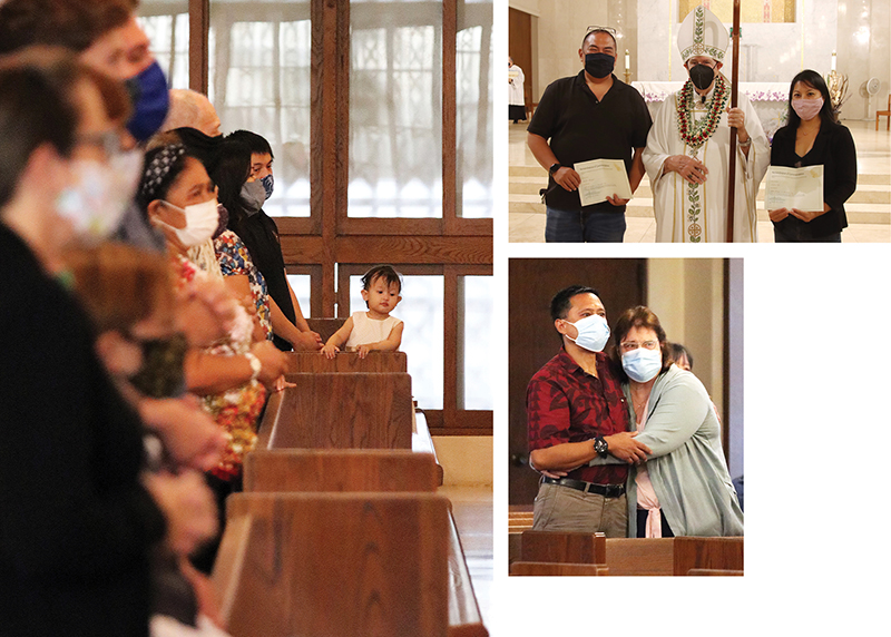 Bishop Larry Silva celebrated a special Mass on the feast of the Annunciation, March 25, at the Co-Cathedral of St. Theresa in Honolulu with a ceremony for families to remember and name their miscarried children. After Mass, those that wanted to could take a photo with Bishop Silva. The liturgy was part of the start of a new diocesan ministry for those suffering from the unplanned loss of an unborn baby. For more information on this ministry, contact Jayne Mondoy, director of the Office for Religious Education and Faith Formation, at 203-6745, jmondoy@rcchawaii.org, or Deacon Gerald (Gary) and Valerie Streff, directors of the Respect Life Office at 203-6722, gstreff@rcchawaii.org. (Photo courtesy of Dann Ebina)
