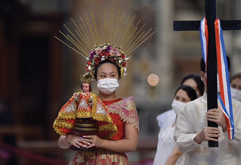 People participate in a procession as Pope Francis celebrates a Mass marking the 500th anniversary of Christianity in the Philippines, in St. Peter’s Basilica at the Vatican, March 14, 2021. (CNS photo/Cristian Gennari, pool)