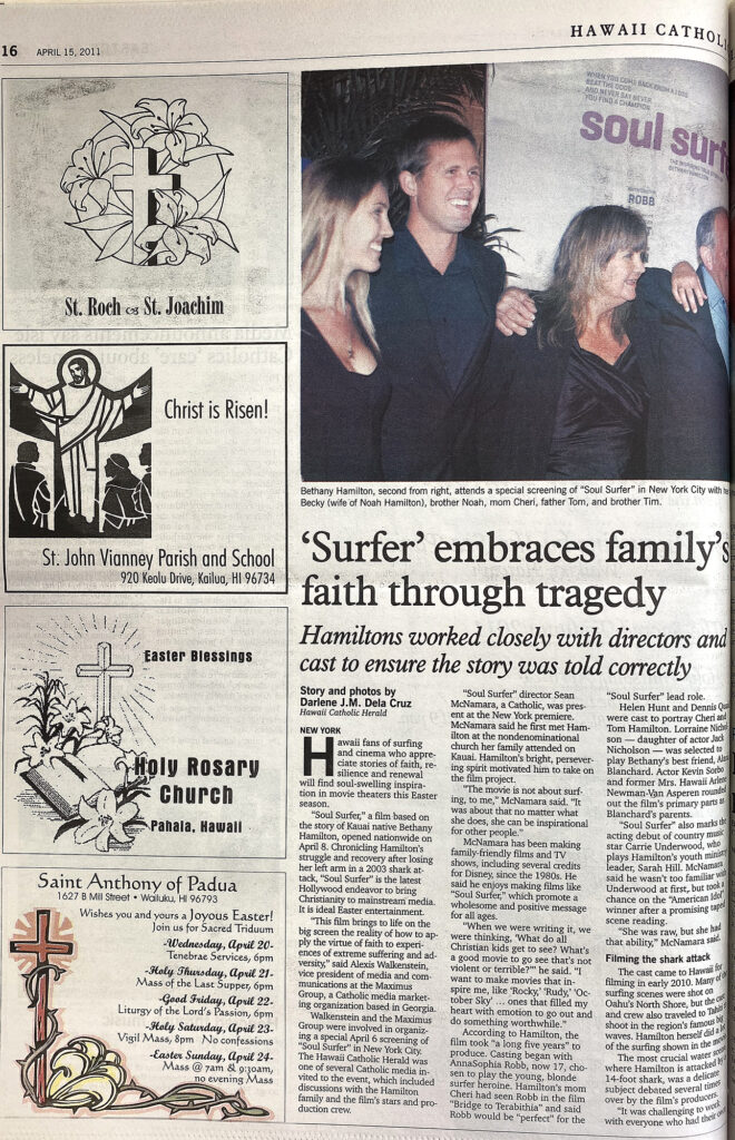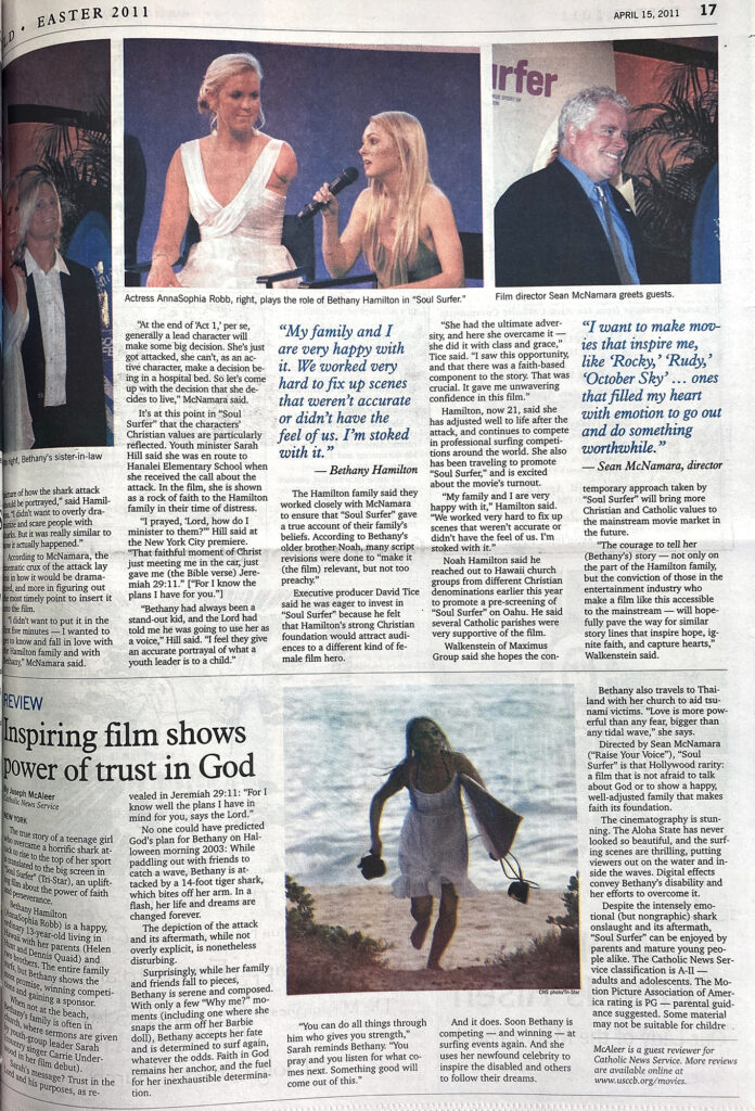 “Soul Surfer,” a film based on the story of Kauai native Bethany Hamilton, opened nationwide on April 8. Chronicling Hamilton’s struggle and recovery after losing her left arm in a 2003 shark attack, “Soul Surfer” is the latest Hollywood endeavor to bring Christianity to mainstream media.