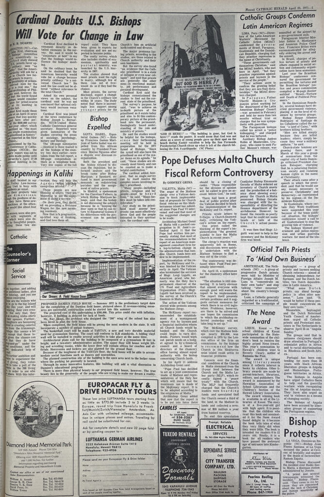 PROPOSED DAMIEN FIELD HOUSE – Summer 1972 is the preliminary target date for the completion of the Damien field house, pictured above. If revenue-raising measures are successful, construction could be started late this summer.