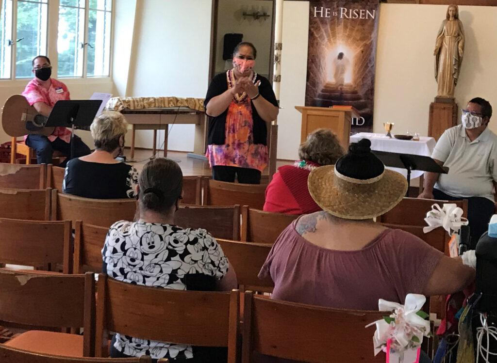 Iwie Tamashiro of the Office for Social Ministry signs during the Ohana Mass on Easter Sunday, April 4, at St. Stephen Diocesan Center’s chapel in Kaneohe. (Courtesy photo)
