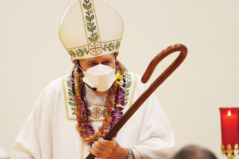 Bishop Larry Silva demonstrates the use of a shepherd’s staff during his homily April 24 for the Sacred Heart Parish Mass in the Maryknoll School Gym. (Photo courtesy of Dann Ebina)