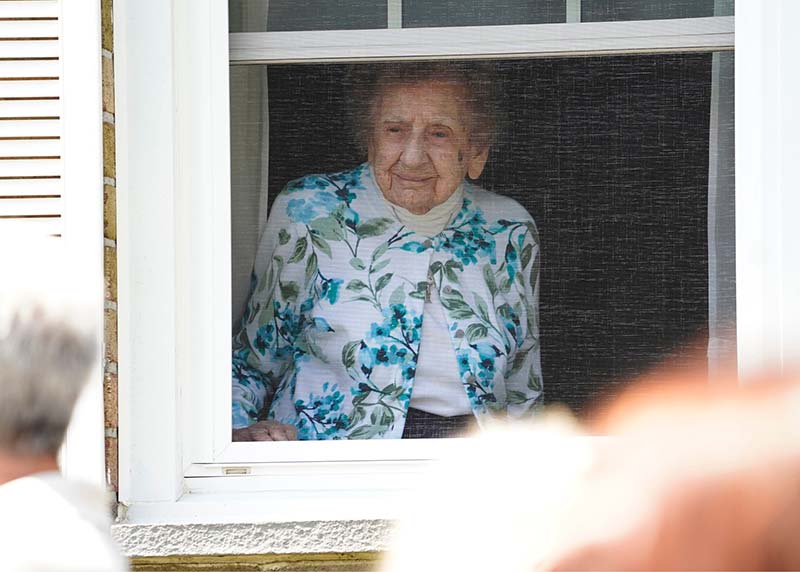 CNS photo/Gregory A. Shemitz Sister Francis Dominici Piscatella, a member of the Sisters of St. Dominic of Amityville, N.Y., looks on as relatives and friends gather outside the window of her East Williston, N.Y., apartment to celebrate her 108th birthday April 20, 2021. According to searchable public data, Sister Piscatella is the second-oldest living religious sister in the U.S.