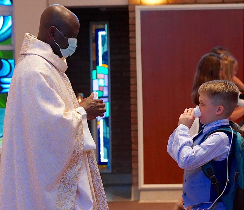 Carson Crosby receives first Communion from Father Augustine Asante at St. Anthony Catholic Church in Columbus, Texas, April 24, 2021. Crosby has a mitochondrial disease that prevents him from consuming food orally so a fraction of the host was dissolved in a small amount of distilled water. (CNS photo/Janet Jones, The Catholic Lighthouse)