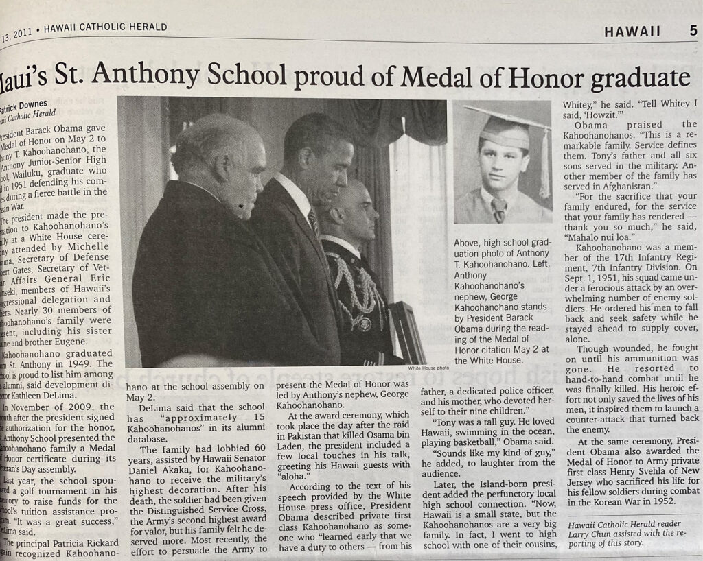 President Barack Obama gave the Medal of Honor on May 2 to Anthony T. Kahoohanohano, the St. Anthony Junior-Senior High School, Wailuku, graduate who died in 1951 defending his comrades during a fierce battle in the Korean War.