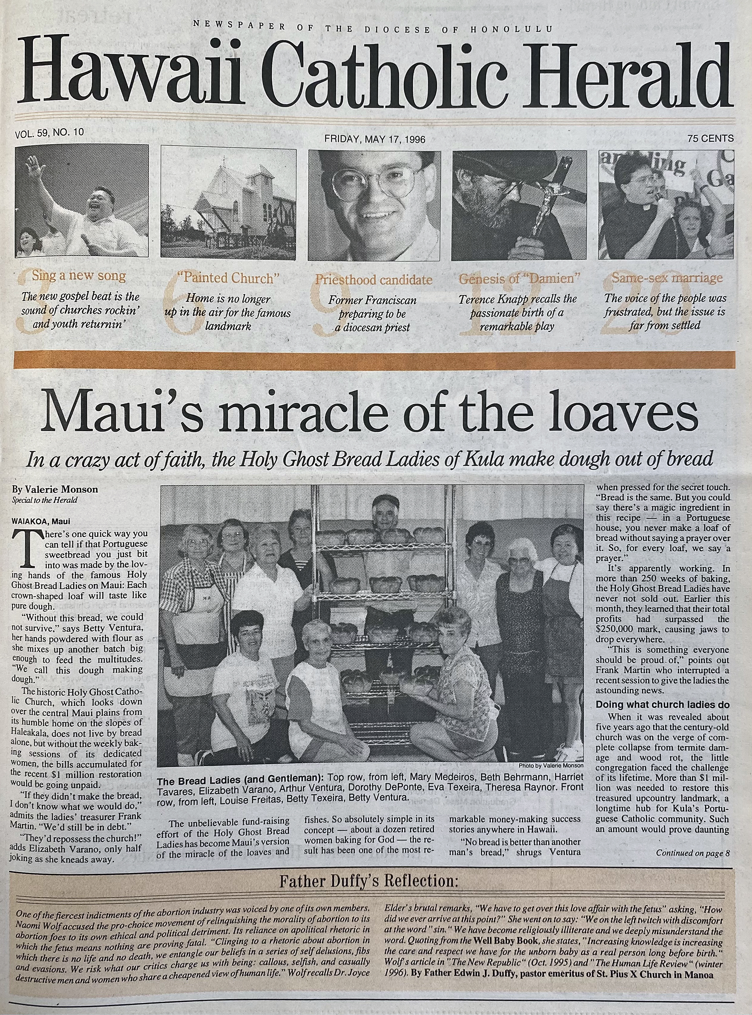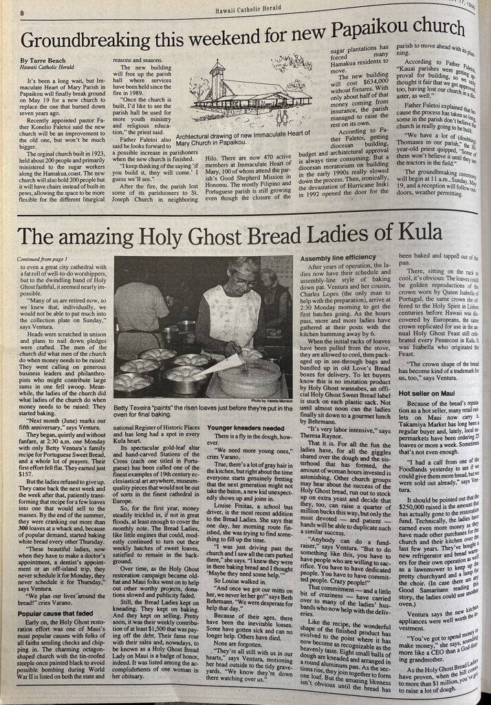 The historic Holy Ghost Catholic Church, which looks down over the central Maui plains from its humble home on the slopes of Haleakala, does not live by bread alone, but without the weekly baking sessions of its dedicated women, the bills accumulated for the recent $1 million restoration would be going unpaid.