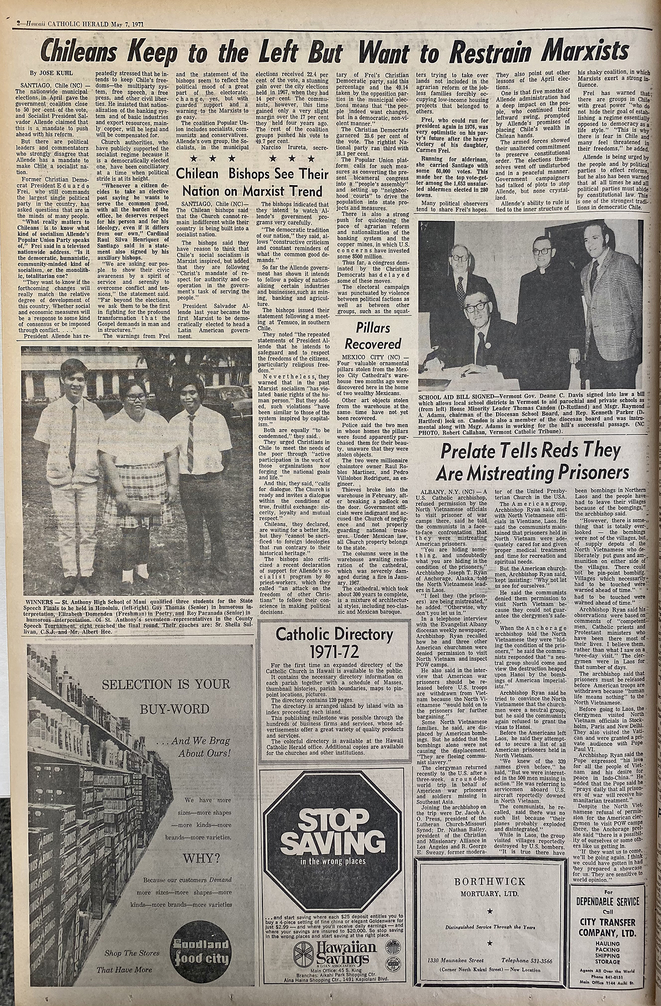 WINNERS – St. Anthony High School of Maui qualified three students, pictured left, for the State Speech Finals to be held in Honolulu, (left-right) Guy Thomas (Senior) in humorous interpretation, Elizabeth Domenden (Freshman) in Poetry and Roy Parananda (Senior) in humorous interpretation. Of St. Anthony’s seventeen representatives in the County Speech Tournament, eight reached the final round. Their coaches are: Sr. Sheila Sullivan, C.S.J. and Mr. Albert Hee.