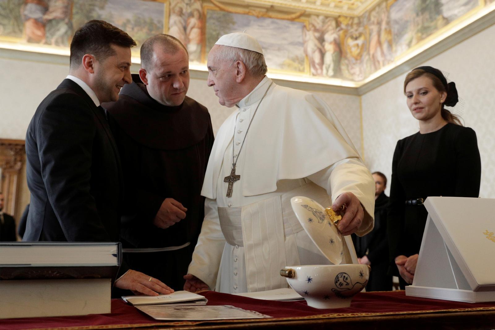 Pope Francis exchanges gifts with Ukrainian President Volodymyr Zelensky during a private audience at the Vatican Feb. 8, 2020. (CNS photo/Gregorio Borgia, pool via Reuters)