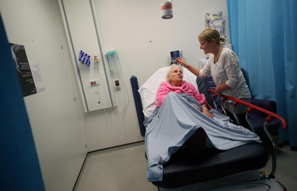 Sarah Plant comforts her grandmother, Barbara Lant, who awaits treatment at Milton Keynes University Hospital in England June 26, 2018. “If we had to pay for health care, we wouldn’t have been able to afford it. I don’t really want to think about what it would have been like,” said Plant. (CNS photo/Hannah McKay, Reuters)