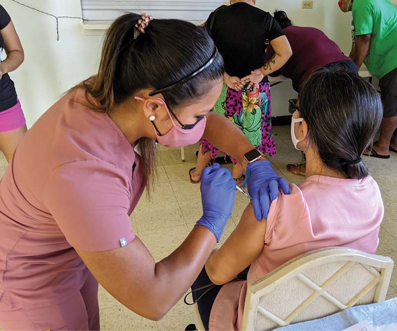 A nurse gives the first vaccination shot of the day at the special COVID-19 vaccination event for the Chuukese Catholic Community in St. Philomena Parish Hall in Salt Lake May 8 from 9 a.m. to 2 p.m. This was the first time the parish hosted a group vaccination for the Chuukese community which uses the parish church for Mass once a month. The leadership of the community was present including president Marvin Bernard, vice president Stephen Francisco, secretary Dolores Alumbau, treasurer Lorna Moses, youth coordinator Alvino Moses, director Jayem Hauk, council member Dominic Rayphand and Legion of Mary president Francisca Bettiru. (Photo courtesy of Jerilyn Chang)