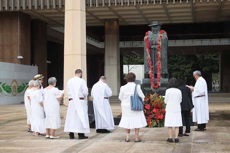 Sisters, brothers and fathers of the Congregation of of the Sacred Hearts of Jesus and Mary gather at the state capitol around the statue of St. Damien de Veuster on his feast day, May 10, for the draping of a lei and prayers. The Belgian-born saint was a member of their religious congregation. The pandemic limited the attendance at the annual commemoration which normally would have included students from Damien Memorial School and Sacred Hearts Academy. (Photo courtesy of Dann Ebina)