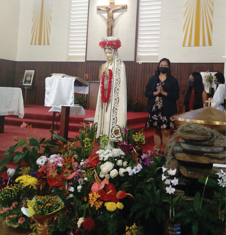 Our Lady of Sorrows Church in Wahiawa on May 2 celebrated the crowning of the Blessed Virgin Mary statue by Chloe Pacheco assisted by Precious Algoso. Over the years, this traditional devotion has evolved in many various ways in different cultures and countries. The crowning of the Blessed Virgin with roses recalls the flowers that miraculously appeared at the apparition of Our Lady of Guadalupe in Mexico. (Photo courtesy of Pacita Baron)