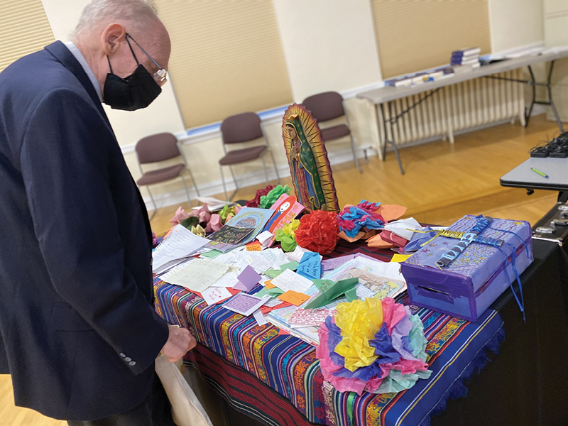 Bishop Guido Charbonneau of Honduras looks at notes written by children in detention camps during a break June 1, 2021, at Mundelein Seminary . (CNS photo/Rhina Guidos)