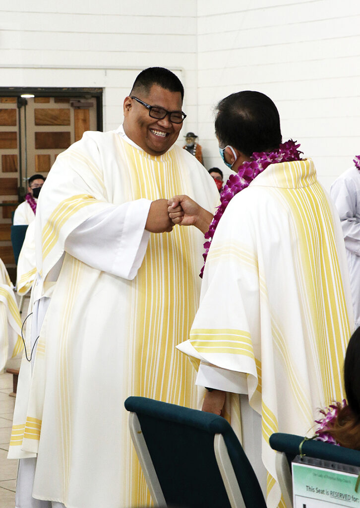 Photo of Father Ed Barut fistbumps newly ordained transitional Deacon Ace Tui