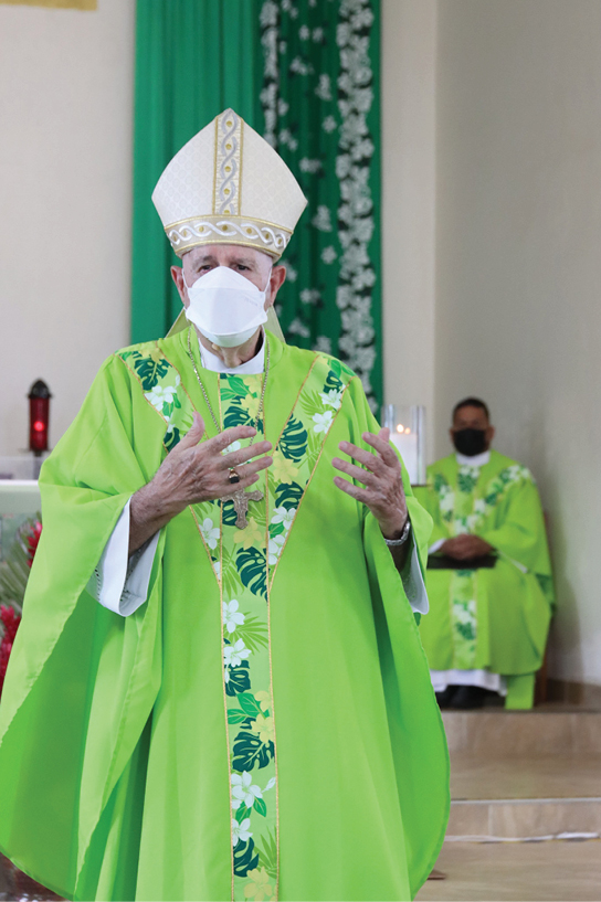 Bishop Larry Silva preaches at the Mass for the installation of Father Romple Emwalu, right, as pastor of St. Michael Church in Waialua July 10. (Photo courtesy of Dann Ebina)