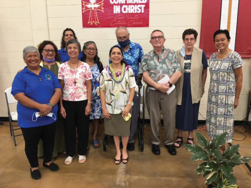 Newly professed Secular Franciscan Ana Monica Cleverdon, center with lei, with fellow Franciscans July 11 at Holy Trinity Parish. (Courtesy photo)