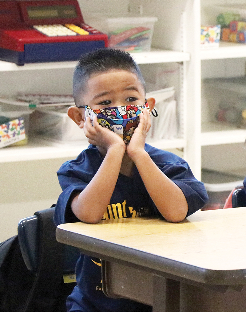 St. Theresa, Honolulu, preschooler Dylan Batangan listens to classroom rules on the first day of school, Aug. 4. (HCH photo | Anna Weaver)