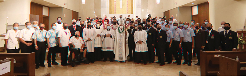 Bishop Larry Silva and more than 50 Hawaii Knights of Columbus gather for a group photo after the evening Mass at the Co-Cathedral of St. Theresa, Honolulu, Aug. 13 honoring Blessed Michael J. McGivney, founder of the Knights, on his first feast day. (Photo courtesy of Dann Ebina)