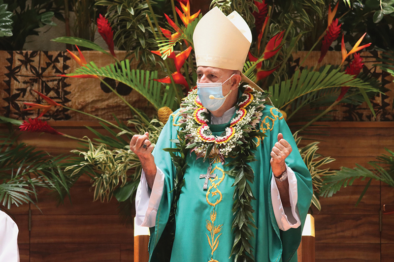 Bishop Larry Silva preaches at St. Theresa Church, Kihei, Aug. 22, at the installation Mass of the new pastor, Father Arnel Soriano. (Photo courtesy of Dann Ebina)