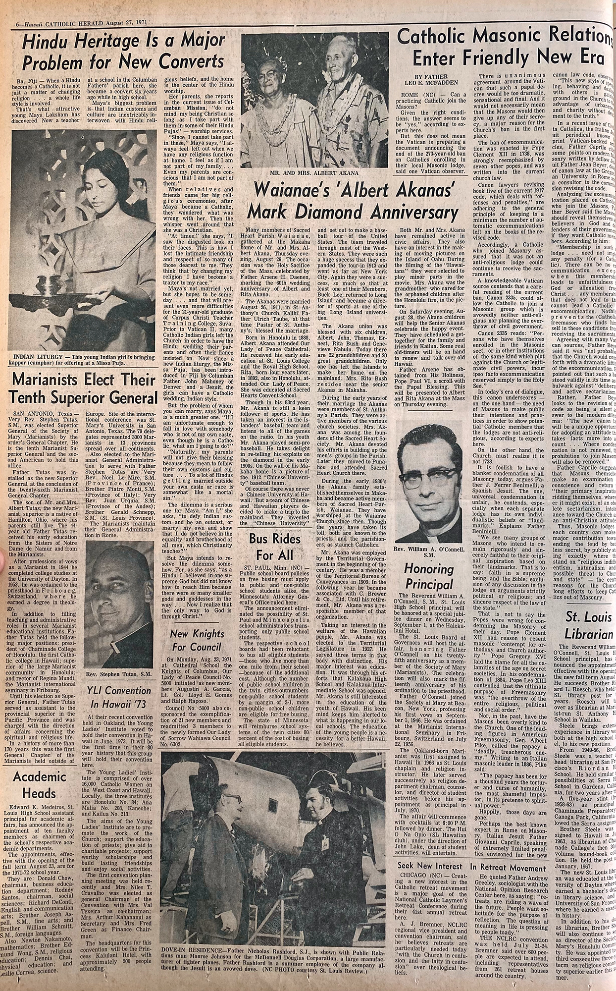 The Akanas were married August 26, 1911, in St. Anthony’s Church, Kalihi. Father Ulrich Taube, at the time Pastor of St. Anthony’s, blessed the marriage. …