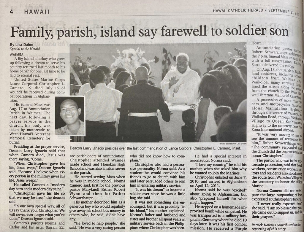 His funeral Mass was Aug. 17 at Annunciation Parish in Waimea. The next day, following a prayer service in the church, his body was taken by motorcade to West Hawaii Veterans Memorial Cemetery for burial. …