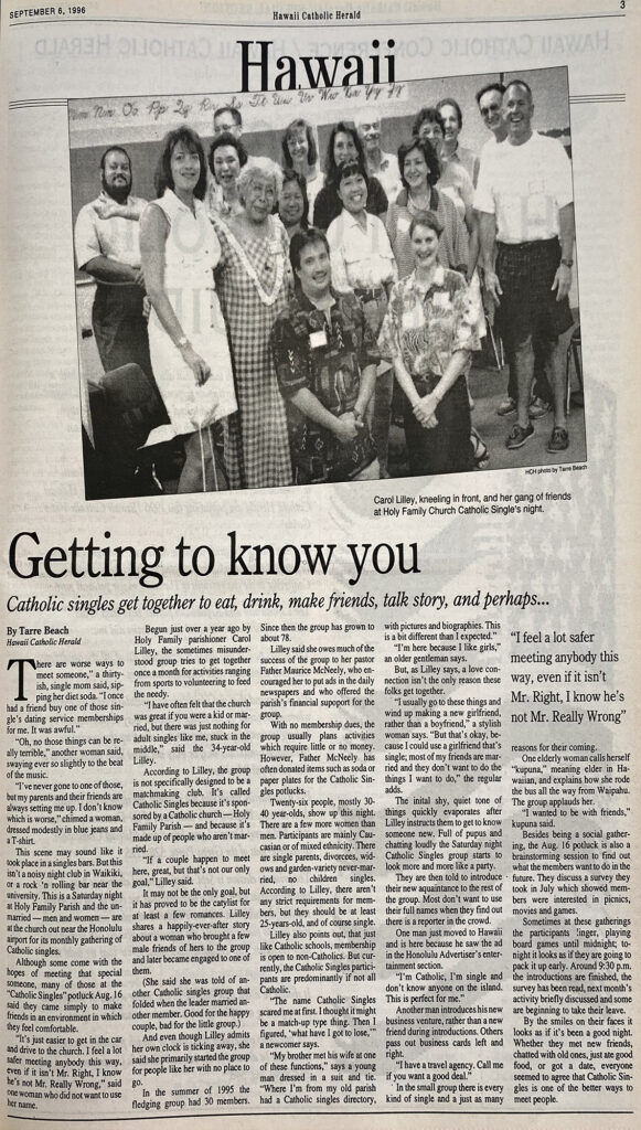 This is a Saturday night at Holy Family Parish and the unmarried — men and women — are at the church out near the Honolulu airport for its monthly gathering of Catholic singles.