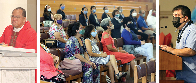 Right: Hawaii Catholic Schools Superintendent Llewellyn Young gave closing remarks at the Aug. 4 Mass at St. Ann. (HCH photo | Anna Weaver)