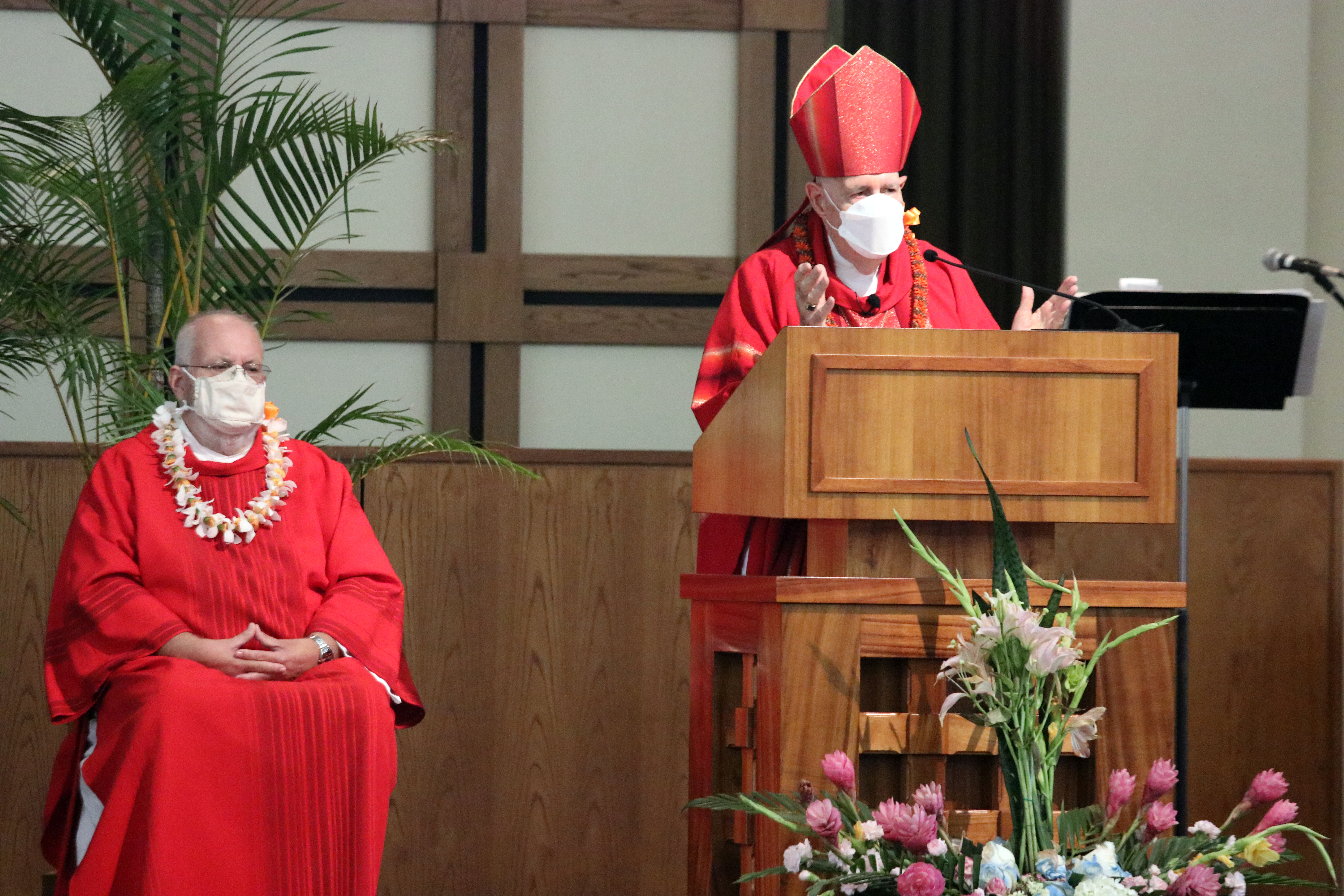 Left: Father Manny Hewe presided at Mass at the Co-Cathedral of St. Theresa in Honolulu. (Photo courtesy of Dann Ebina)