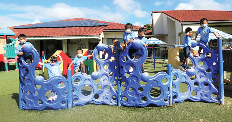 Photo: First day of school 09/01/2021 by Hawaii Catholic Herald Students of Rosary Preschool, Waipahu, Class 4-A, posing on their jungle gym on the first day of school, Aug. 10, prepare to climb to new heights of learning this school year. (Photo courtesy of Lora Ogawa)