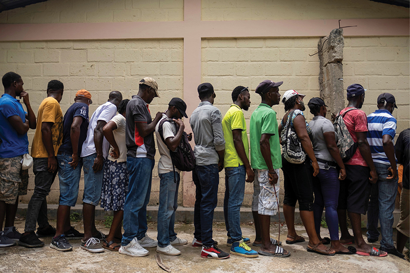 Earthquake victims wait in line for food provided by the World Food Program at a school in Port Salut, Haiti, Aug. 24. (CNS photo/Ricardo Arduengo, Reuters)
