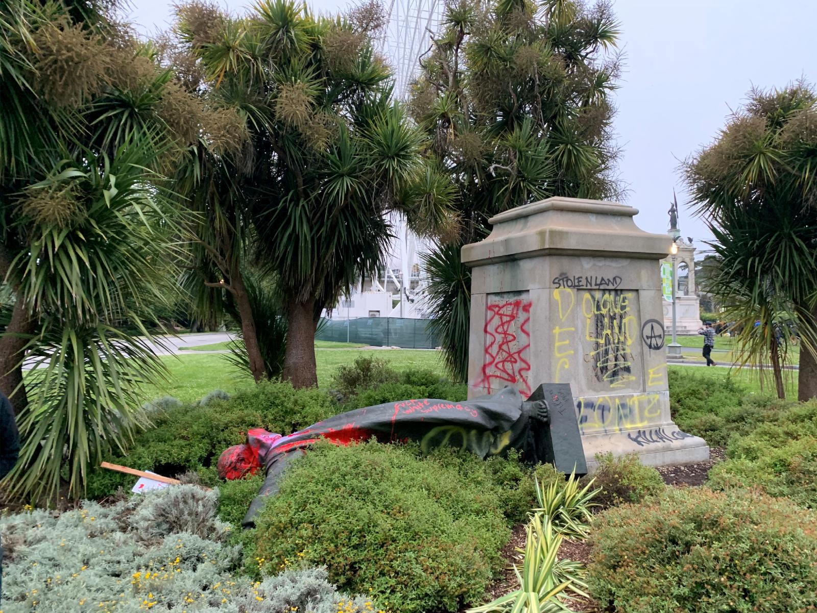 A vandalized statue of St. Junipero Serra in San Francisco is seen June 19, 2020. The Spanish Franciscan founded several missions in what is now California. (CNS photo/David Zandman via Reuters)