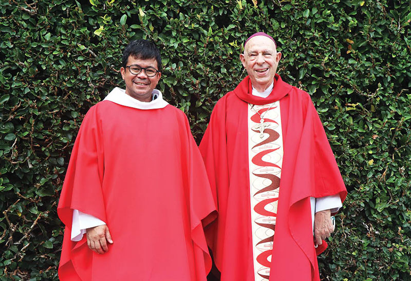 Father Joseph “Bong” Diaz and Bishop Larry Silva posed for photos before Mass on Sept. 16 during the the annual priests retreat at St. Stephen Diocesan Center in Kaneohe. Father Diaz was incardinated as a priest for the Diocese of Honolulu during that Mass. See story on page 7. (HCH photo | Anna Weaver)