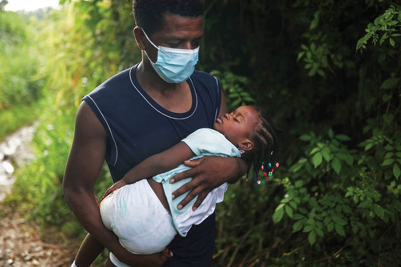 A Haitian migrant carries a child as he walks through the forest in Tuxtla Chico, Mexico, Sept. 16, 2021, as part of a group of thousands of migrants who were heading to the U.S. border. (CNS photo/Edgard Garrido, Reuters)