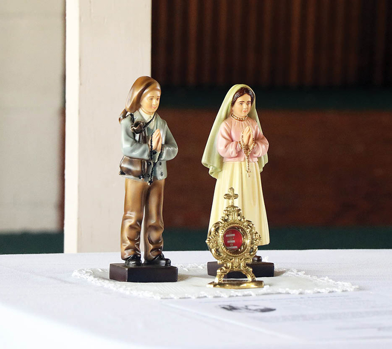 St. John Vianney religious education student Adrian Barney and his mother Katherine look at a relic and statues of Sts. Francisco and Jacinta Marto, two of the three children who saw Mary’s appearances at Fatima in the early 1900s. (HCH photo | Anna Weaver)