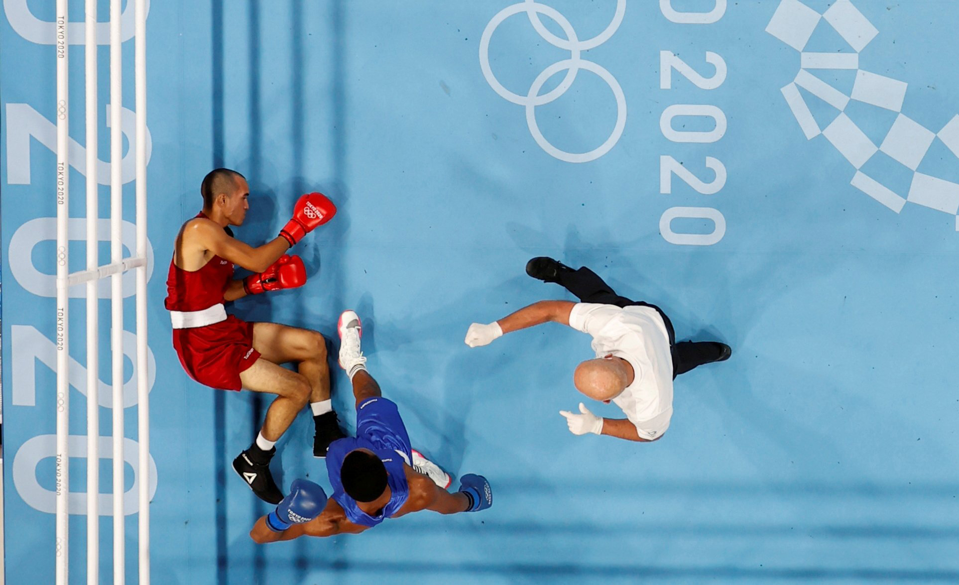 Eldric Sella Rodriguez of the Refugee Olympic Team lies on the mat after being knocked down during his fight against Euri Cedeno Martinez of the Dominican Republic in the Men’s Middleweight Boxing at the 2020 Tokyo Olympics July 26, 2021. This year’s Refugee Olympic Team was made up of 29 athletes from a dozen countries who have been living and training in host countries. (CNS photo/Ueslei Marcelino, Reuters)