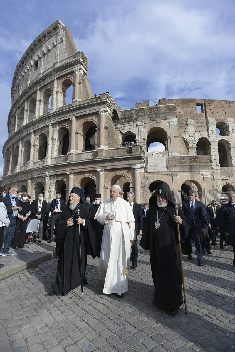 Ecumenical Patriarch Bartholomew of Constantinople, Pope Francis and Catholicos Karekin II, patriarch of the Armenian Apostolic Church, walk together after a Christian prayer service in front of the Colosseum in Rome Oct. 7, 2021. The prayer service was part of an event to plead and pray for peace. (CNS photo/Stefano Dal Pozzolo, pool) (CNS photo/Stefano Dal Pozzolo, pool)